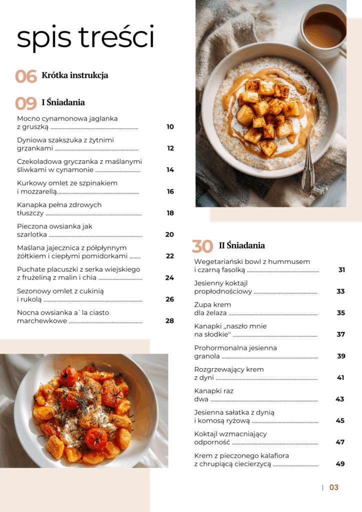 Posiłki w eBooku opierają się na pełnotłustym i półtłustym nabiale, nie zawierają pszenicy, a także oferują różnorodność – znajdziesz zarówno trochę mięsa, jak i białka roślinnego. Każdy posiłek został zaprojektowany tak, aby wspierał Twoją odporność i odżywiał ciałko żółte, co jest kluczowe w procesie starań o ciążę. Te starannie dobrane składniki pomagają nie tylko w prawidłowym funkcjonowaniu organizmu, ale również w poprawie zdrowia hormonalnego oraz płodności.